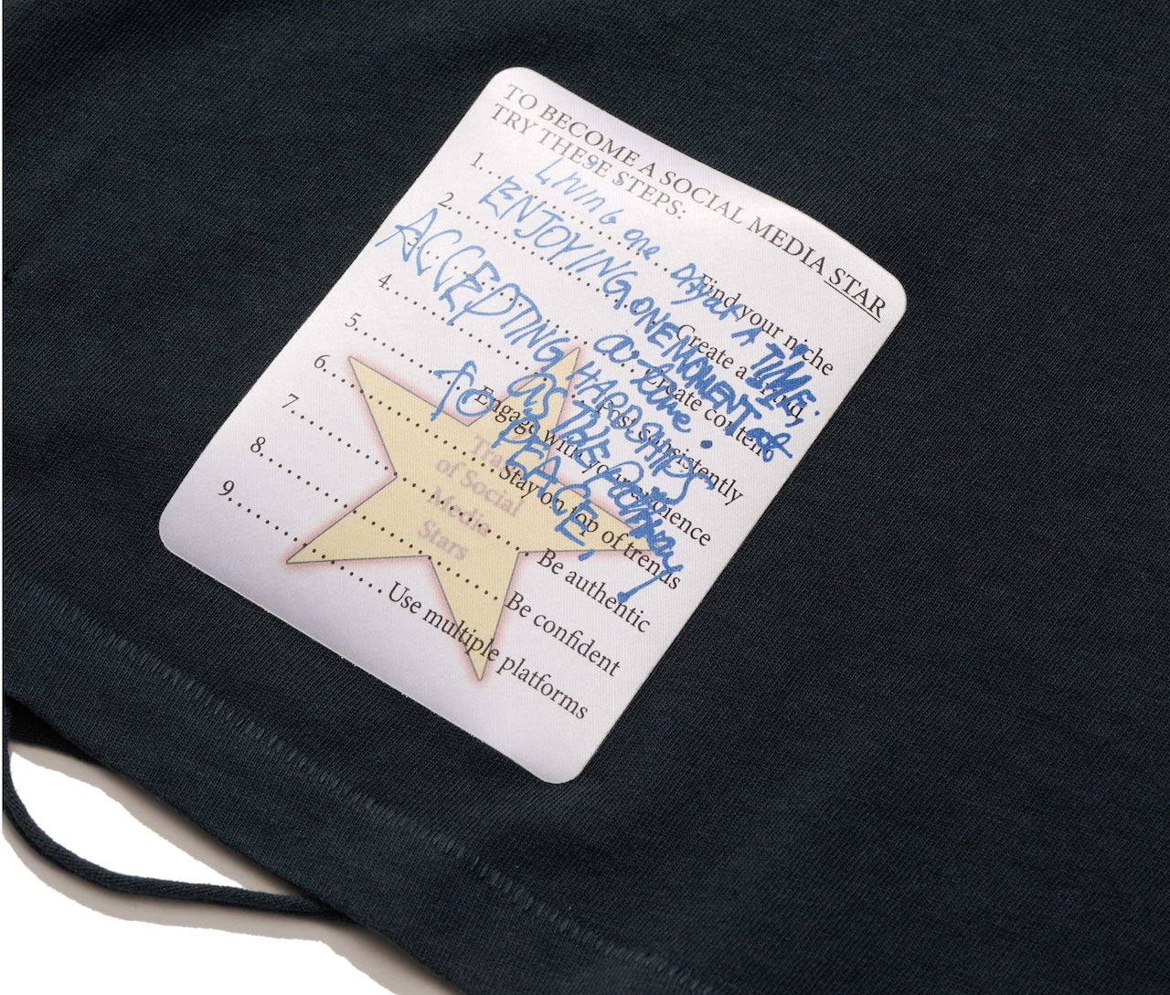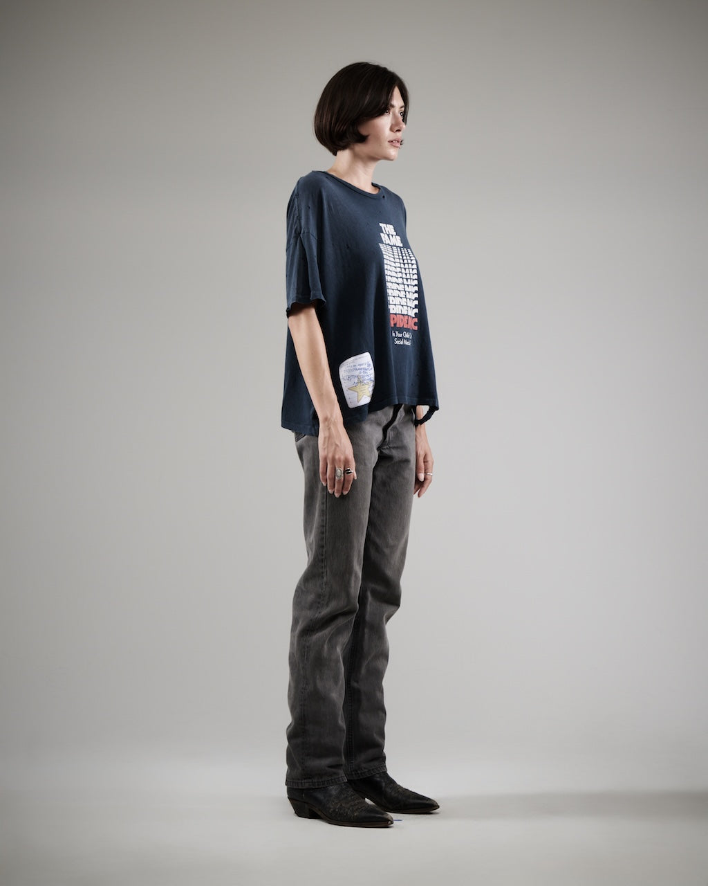 - Printed graphic authentically distressed at front and satin label at bottom hem
