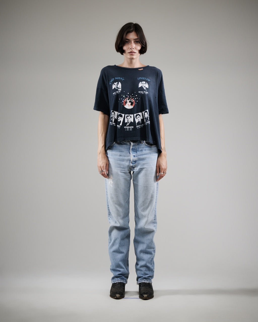 - Printed graphic authentically distressed at front with rhinestone accents