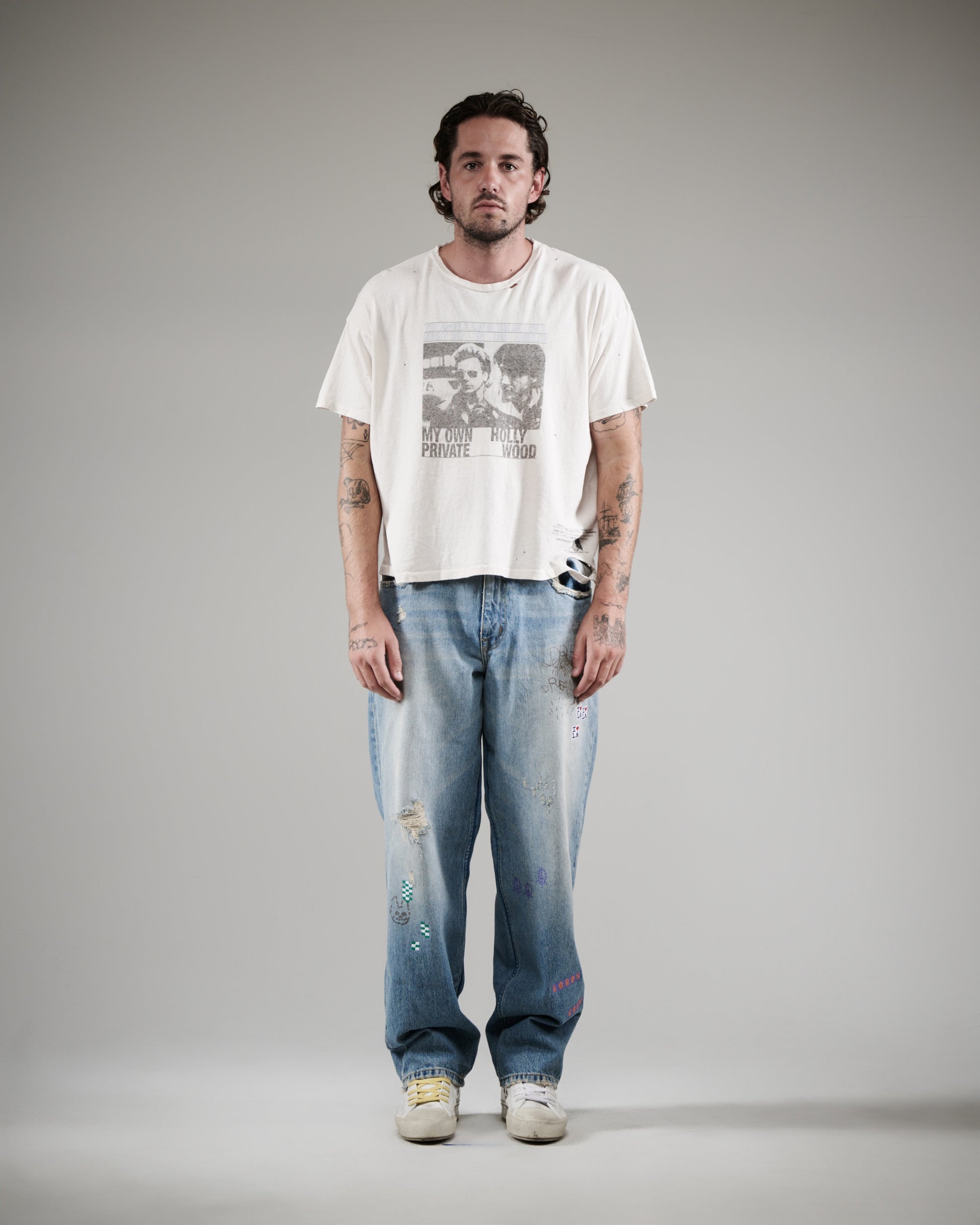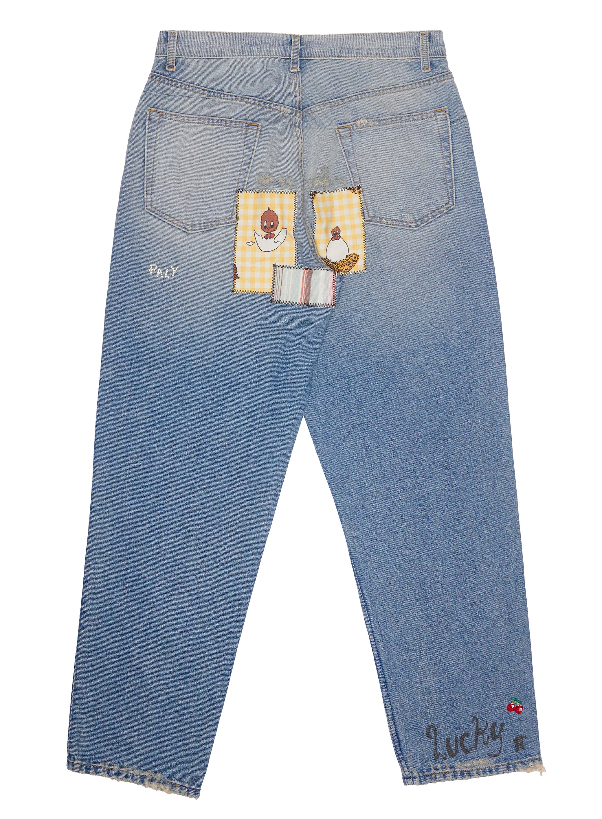 - Baggy fit denim 5-pocket jean w/ slightly tapered leg