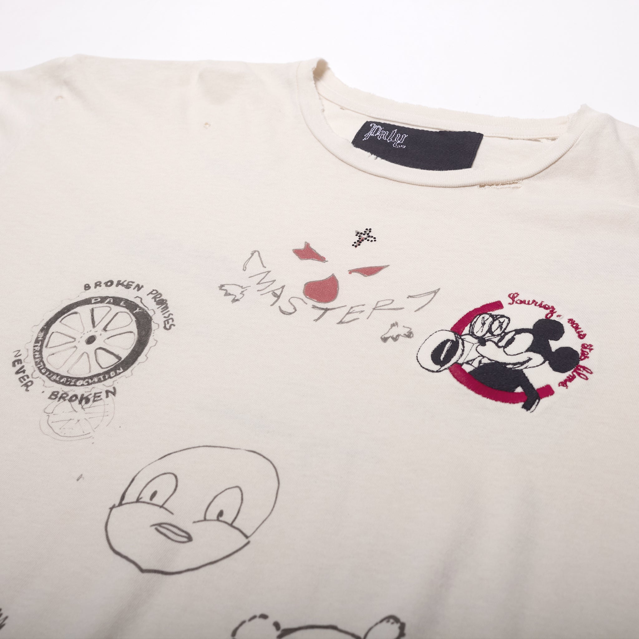 - Areas of hand distressing at neck, hem, and body