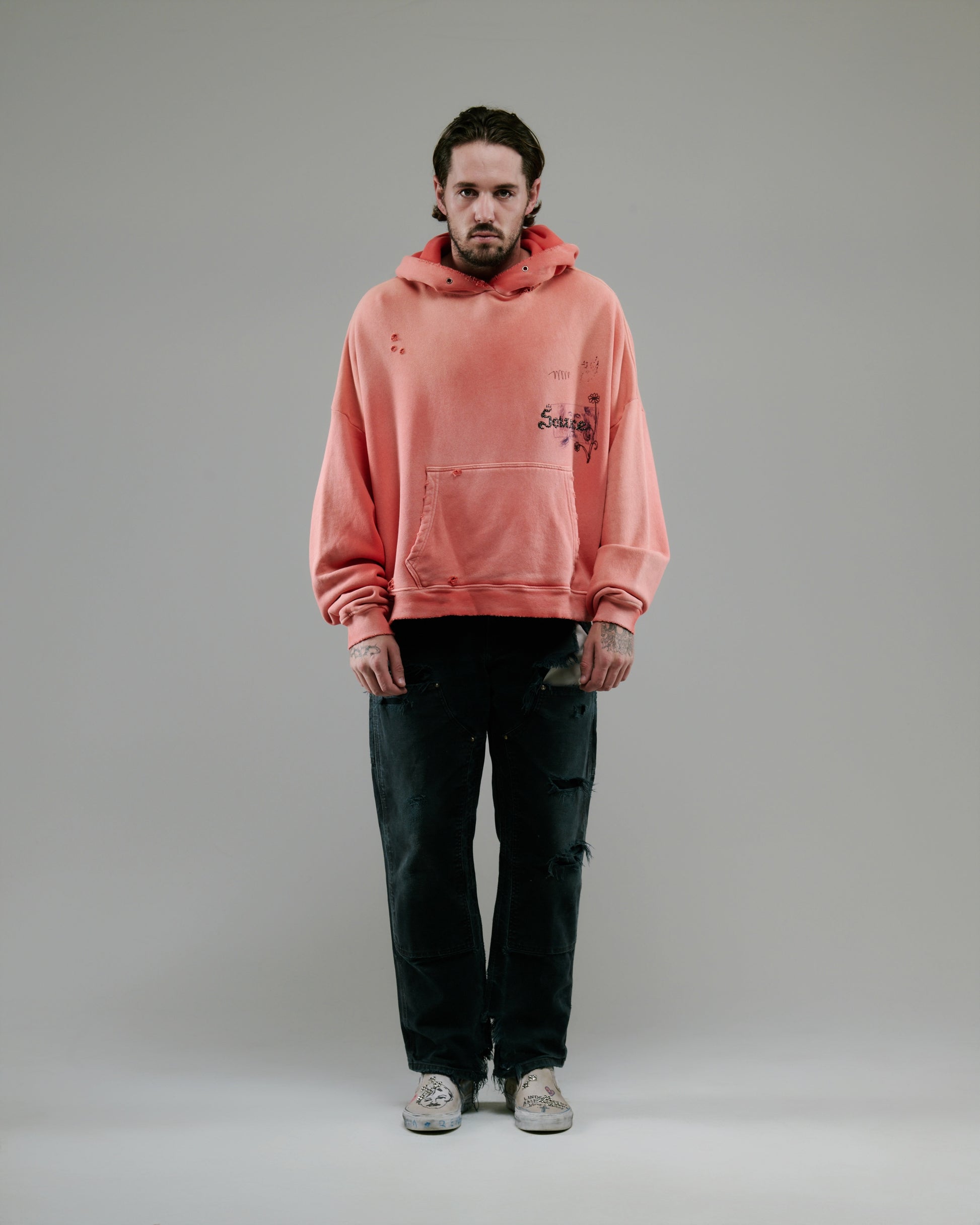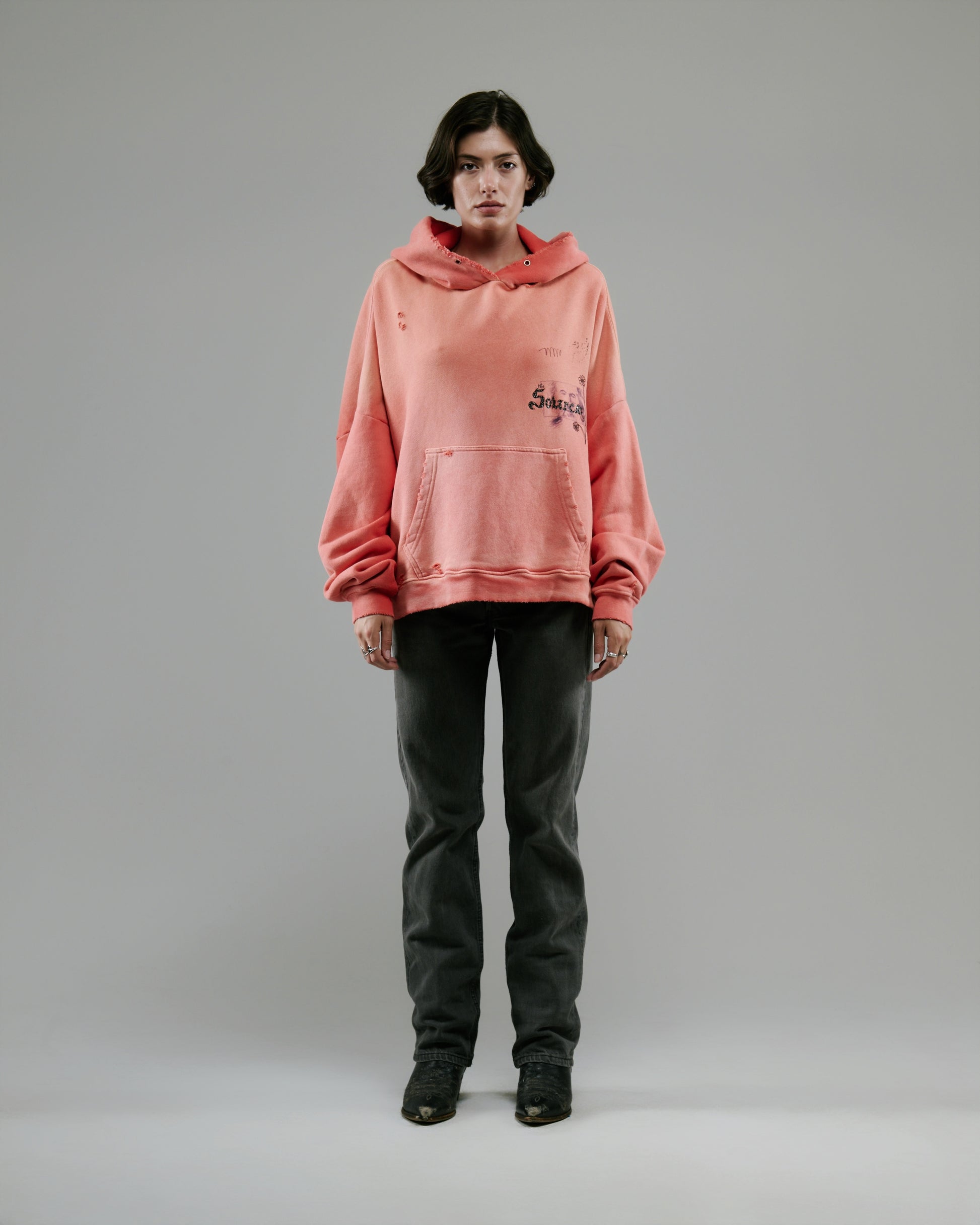 - Areas of hand distressing at cuffs, hem, body, and hood